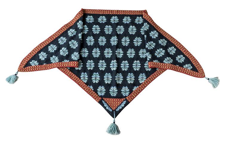 Das Caledonia-Tuch Winter ist ein atemberaubendes Dreieckstuch mit leuchtend-blauen Blüten auf einem stimmungsvollen, dunklen Hintergrund. Vor allem die farbliche Absetzung der in warmen Farben gehaltenen Bordüre ist ein besonders moderner Hingucker.