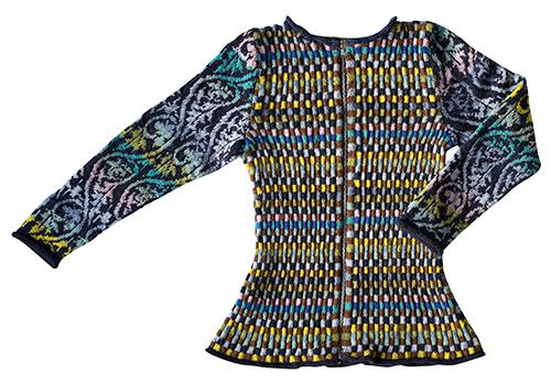 Die Strickjacke Fano Retro vereint Christel Seyfarths berühmte Blumenranken-Muster mit einer traditionellen Farbgebung und einem chicken taillierten Schnitt.