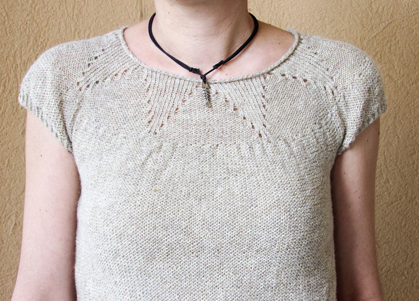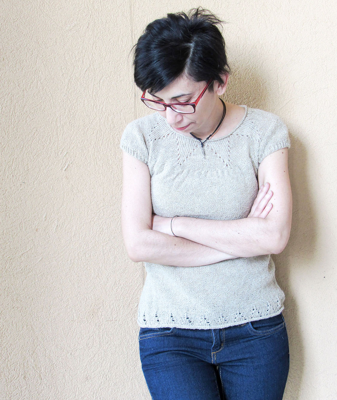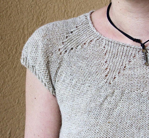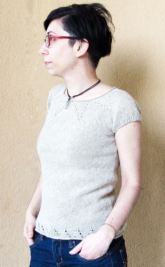 Das Top sollte ohne Bequemlichkeitszugabe getragen werden. Deshalb bitte die Größe wählen, die am besten zu Ihren eigenen Maßen passt. Das Top sollte in dünner Wolle mit dickeren Nadeln gestrickt werden.