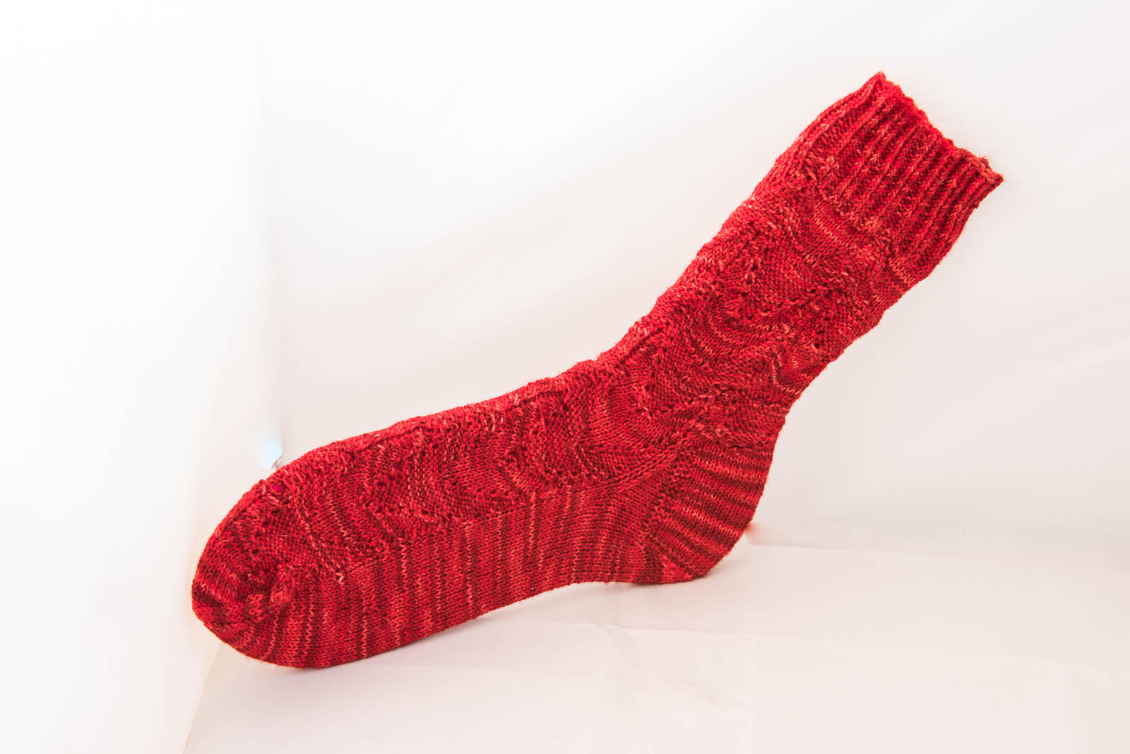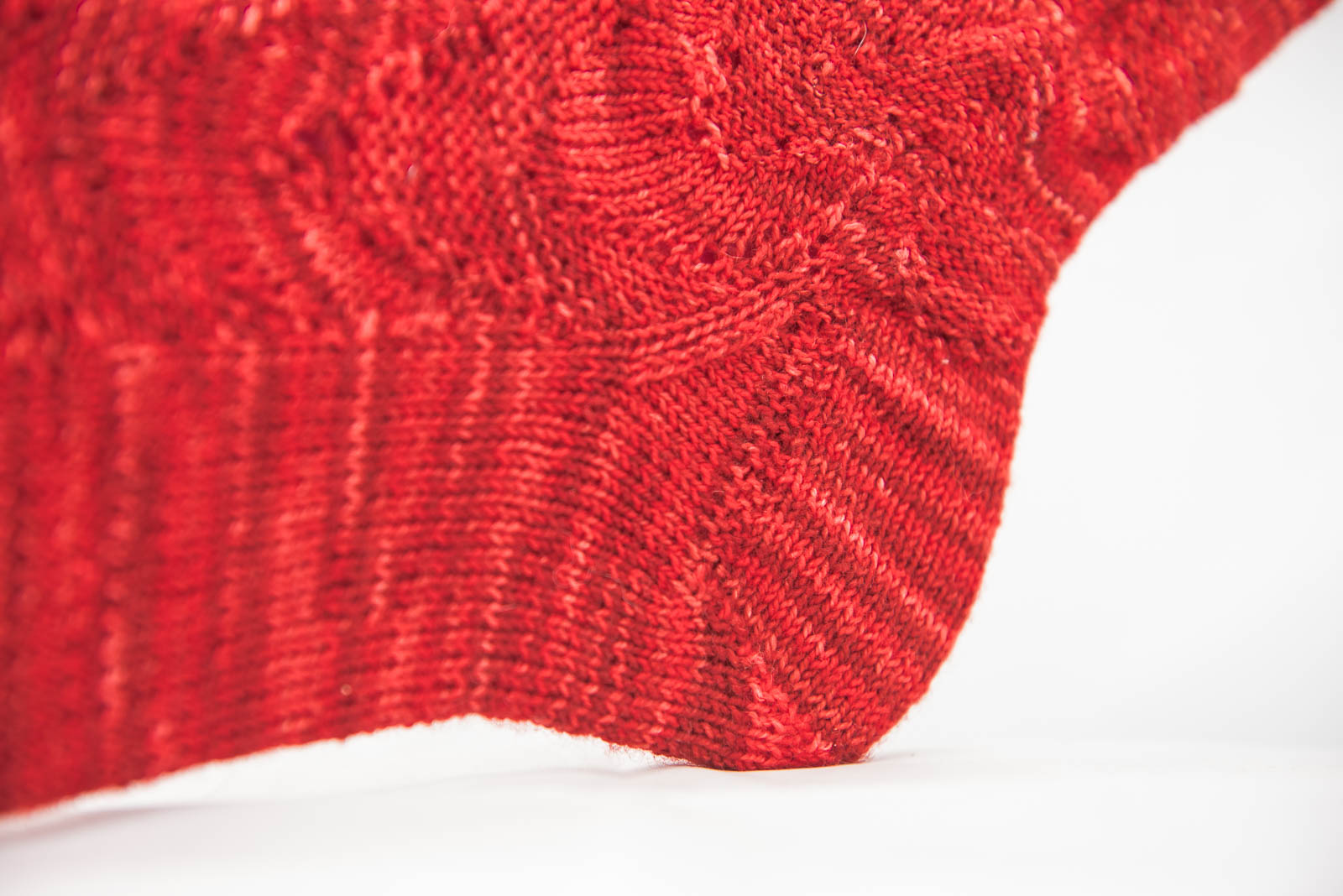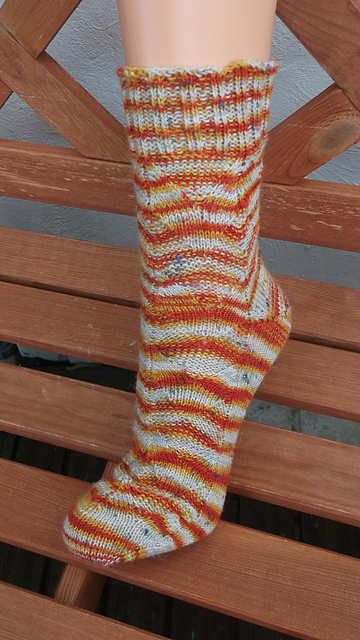 Ein simples Muster aus zusammengestricken und verschränkt aufgenommenen Maschen ergibt weich ineinanderfließende Bögen. Bumerangferse und der Wechsel von rechts und links gestrickten Flächen sorgen für eine gute Passform.