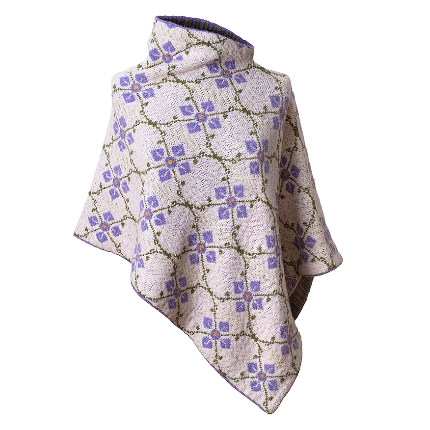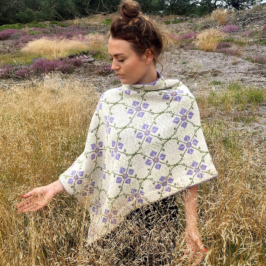 Asymmetrischer PONCHO mit einem schönen Blumenmuster. Ein Teil der Stiele ist gestickt, ebenso die Innenseite der Blumen und ein Teil der inneren Muster. Der Poncho wird in Runden mit Steeks gestrickt.